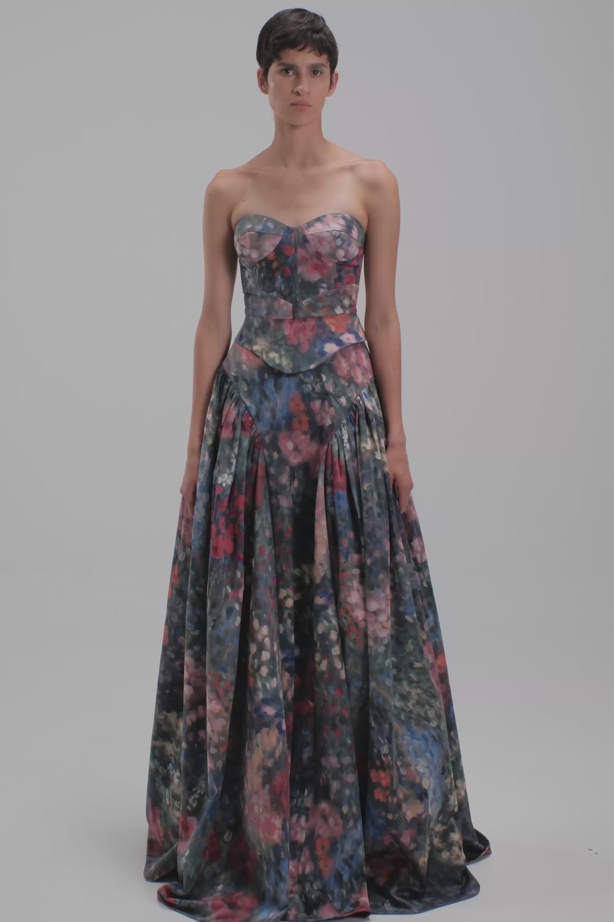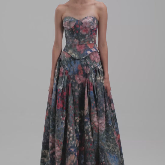 The Contorno Corset features a structured, strapless silhouette with defined cups and contouring seams. Crafted in a vibrant floral print, it offers a sculpted fit that enhances the waist, making it a statement piece for layering or wearing solo.