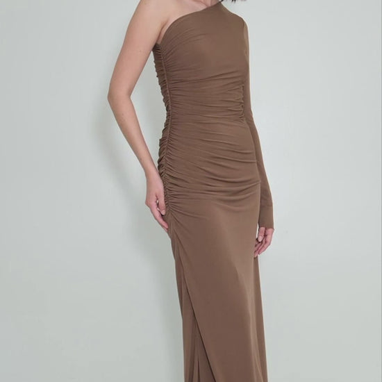 The Elemento Maxi Dress combines bold style with sleek allure, featuring an asymmetrical one-shoulder silhouette and a long sleeve on one side. Crafted from soft, stretchy material, subtle ruching enhances the contours for a flattering, sculpted look that offers both elegance and comfort.