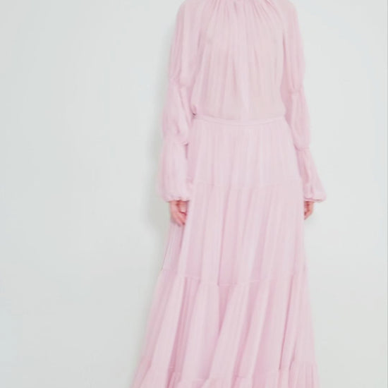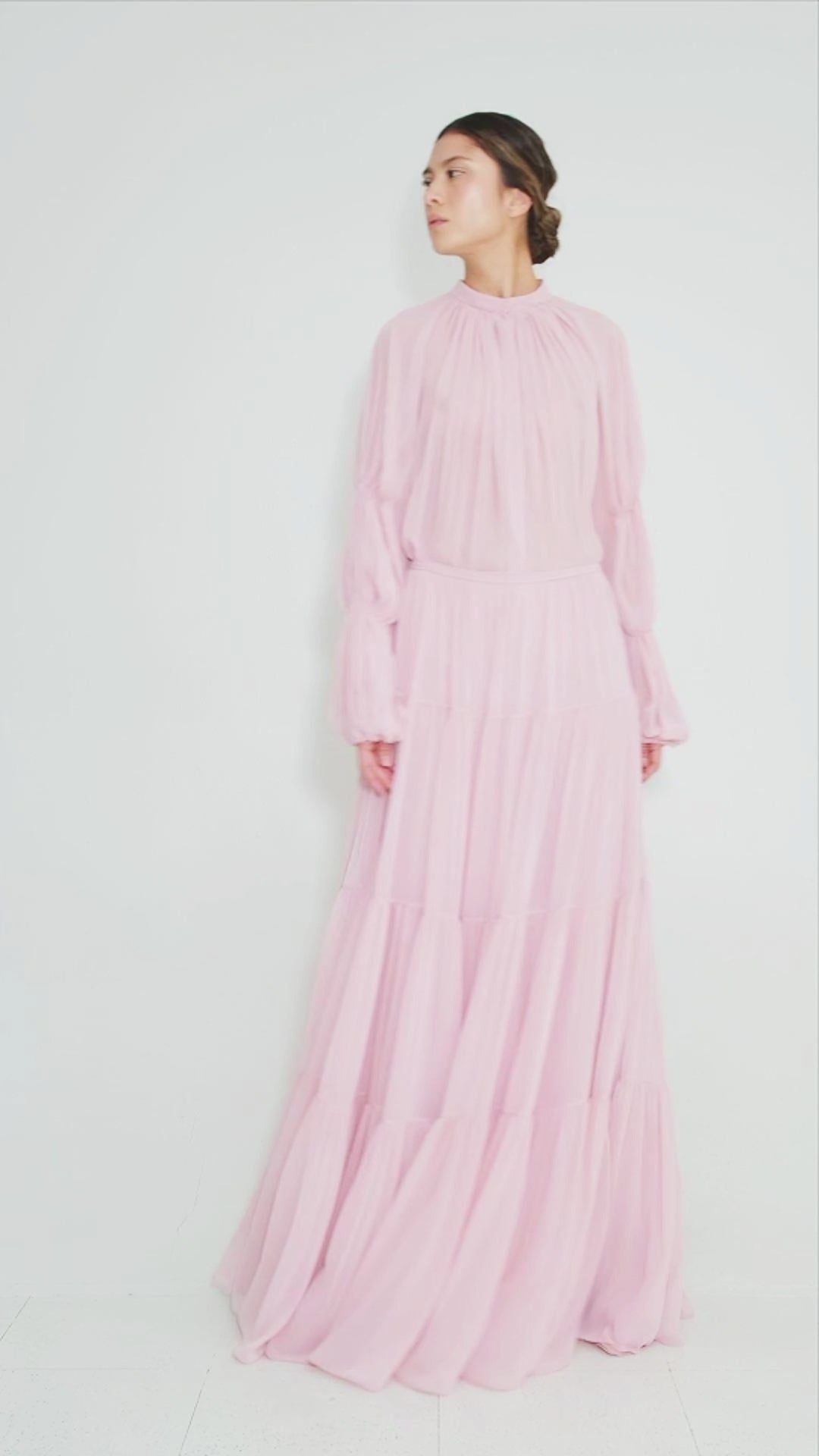Crafted from lightweight, semi-sheer fabric, this blouse features a high neckline, vertical ruching, and voluminous long sleeves for a refined, dramatic look. Pair it with our Éterea Maxi Skirt for a modern, elegant ensemble.