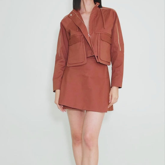 The Pliegue Mini Skirt combines classic tailoring with a modern twist, featuring clean lines and a flattering silhouette. Its high-waisted design and front flap detail create a streamlined look, making it a versatile day-to-night staple.