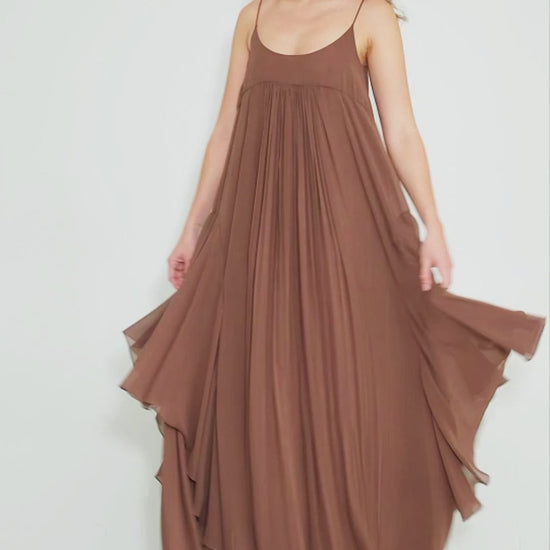 This flowing maxi dress features cascading, asymmetrical layers and a draped silhouette that exude relaxed elegance. Delicate spaghetti straps complement its effortless design, making it a versatile piece ideal for seamless day-to-night transitions.